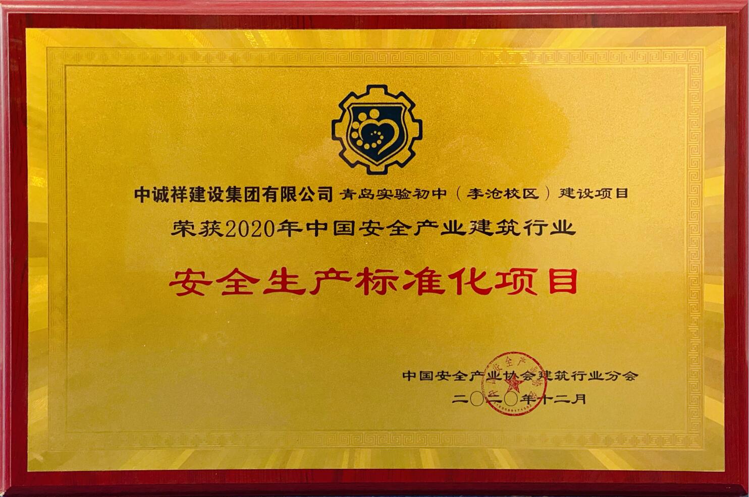 近日,从中国安全产业协会建筑行业分会传来喜讯,由集团公司承建的青岛实验初中(李沧校区)建设项目荣获“2020年中国安全产业协会建筑行业分会安全生产标准化项目”荣誉称号。