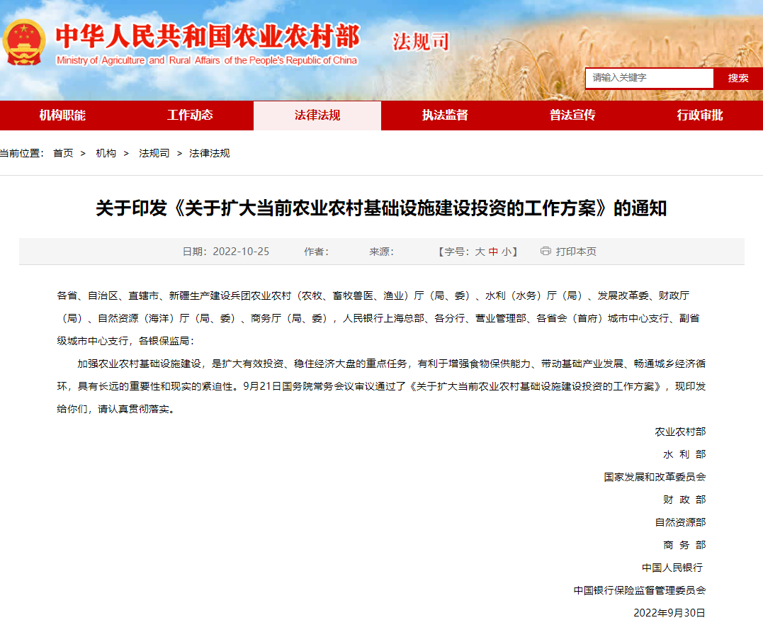 近日,农业农村部等八部门印发了《关于扩大当前农业农村基础设施建设投资的工作方案》。其中提出,从现在到年底前,聚焦农业农村基础设施短板弱项,突出抓好重点项目建设,确保尽快开工、尽快见效。
