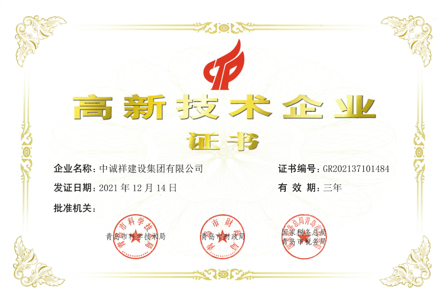 脚踏实地,稳步发展。中诚祥建设集团始终坚持高质量发展,重视科技创新带来的“质”的飞跃和改变,推动企业发展摆脱传统观念、模式和路径依赖,不断加快实现创新驱动高质量发展,目前已经获批青岛市高新企业、青岛市企业技术中心。