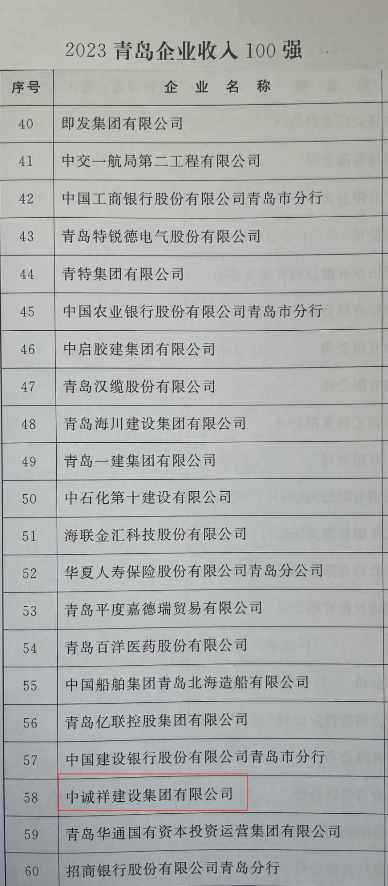 11月7日下午,青岛市企业联合会、企业家协会举办“青企聚力·扬帆奋进”青岛企业家日活动,并发布了“2023青岛企业100强”榜单,中诚祥建设集团入选其中,排名58位,较上次提升28位。