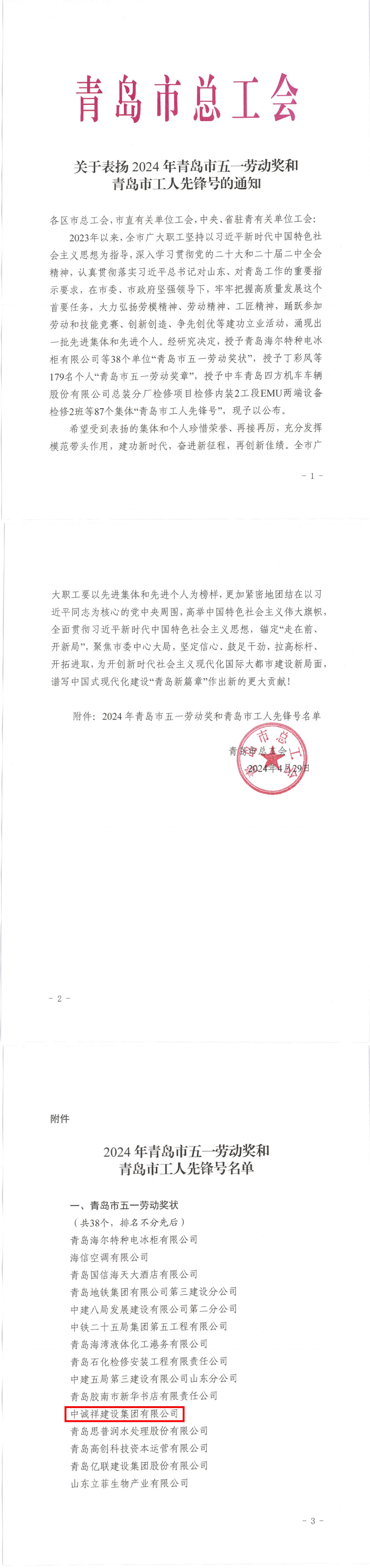 2024年4月29日,青岛市总工会授予中诚祥建设集团有限公司青岛市五一劳动奖状荣誉称号。