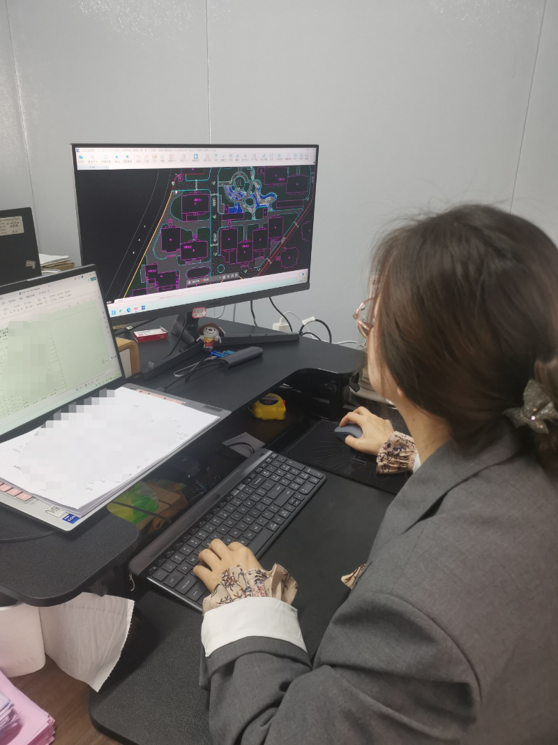 她负责着金门路和香港中路两个项目的商务预算工作,数据繁多,她持续关注着甲方、公司、供应商的需求和现场施工情况,严格地对项目工程量、材料类别进行审核,为项目运转提供精确地数据支撑。
