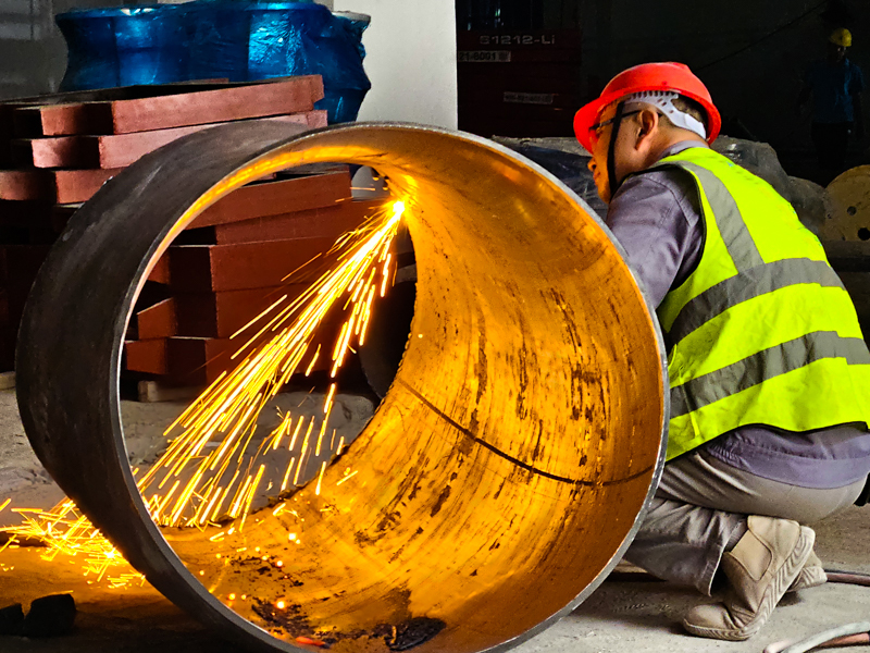 在地下安装现场,刘庆瑞注视着四吨重的管道缓缓落下,在拖车的牵引和工人们的协同下,一步步被运往指定地点,现场焊接的火光通明,机械的轰鸣在耳边回响,建设者们各司其职,有序地开展室内安装工作。